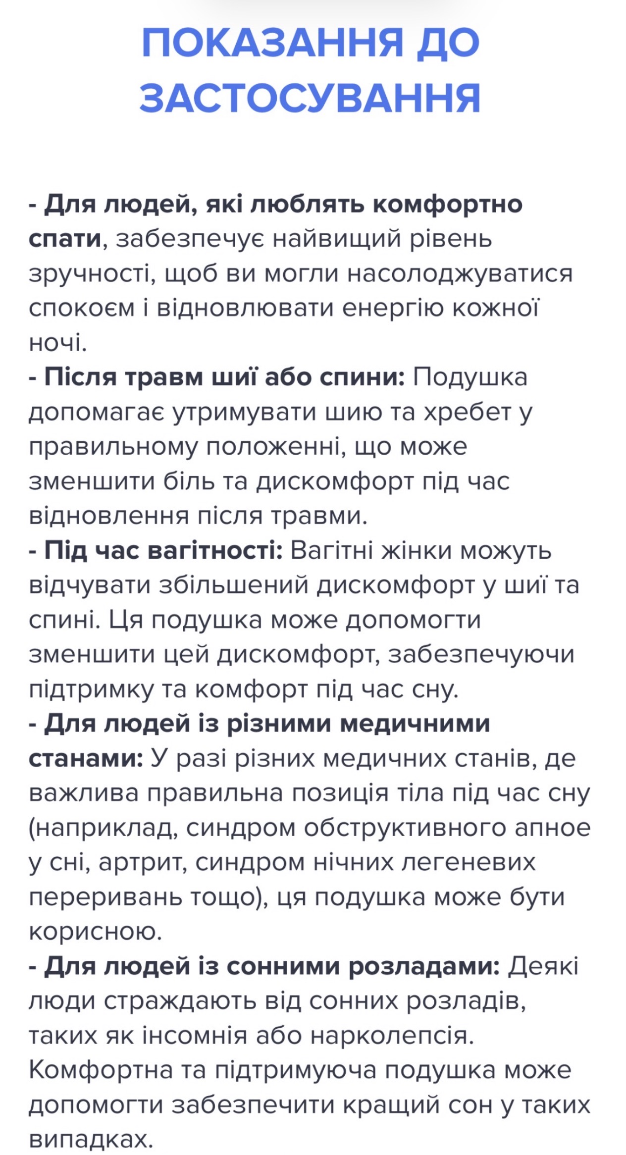 Дуже гарної якості подушка, приємна на дотик, дійсно після користування нею відчула полегшення болю в області шиї. Шви виконані якісно, наповнювач не продавлюється. Рекомендую